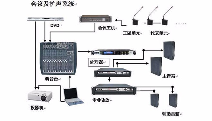 會議音響系統(tǒng),則主要應(yīng)用于會議、培訓(xùn)、講座等的擴(kuò)聲。會議音響主要考慮采用會議專用擴(kuò)聲系統(tǒng)(注:如手拉手會議)或常規(guī)擴(kuò)聲系統(tǒng),配置相應(yīng)的會議話筒等。
