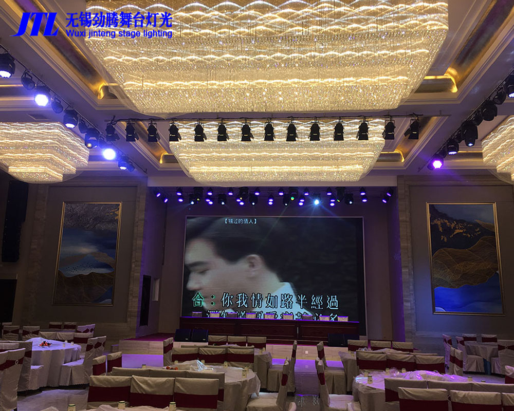 宴會廳是用來舉行大中型宴會、婚禮慶典、酒會、會議等的場所,燈光要求相對較高,專門承接婚禮的宴會廳一般需要舞臺效果燈的數(shù)量多些,JTL搖頭光束燈、染色燈等通過調(diào)節(jié)變換燈光、顏色、圖案,來營造浪漫溫馨的舞臺效果,調(diào)動全場情緒和氛圍。