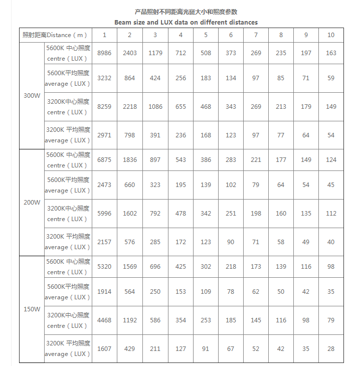 10、產(chǎn)品輸出光通量:300W(5600K 25610 Im,3200K 22940 Im),200W(5600K 19220 Im,3200K 17145 Im),150W(5600K 14915 Im,3200K 12530 Im)